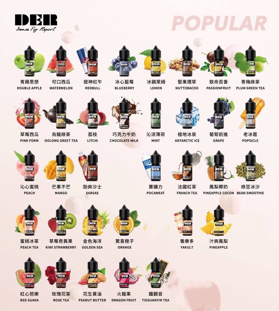 青蘋果, 西瓜, 紅牛, 藍莓, 萊姆檸檬, 百香果, 青莓綠, 草莓西瓜, 烏龍綠茶, 荔枝, 薄荷, 冰泉, 葡萄, 老冰棍, 蜜桃, 芒果, 沙士, 寶礦力, 蜜桃冰茶, 百香果鳳梨蔓越美, 橙子, 鳳梨, 芭樂, 玫瑰花茶, 火龍果, 鐵觀音, 批發10瓶起私談