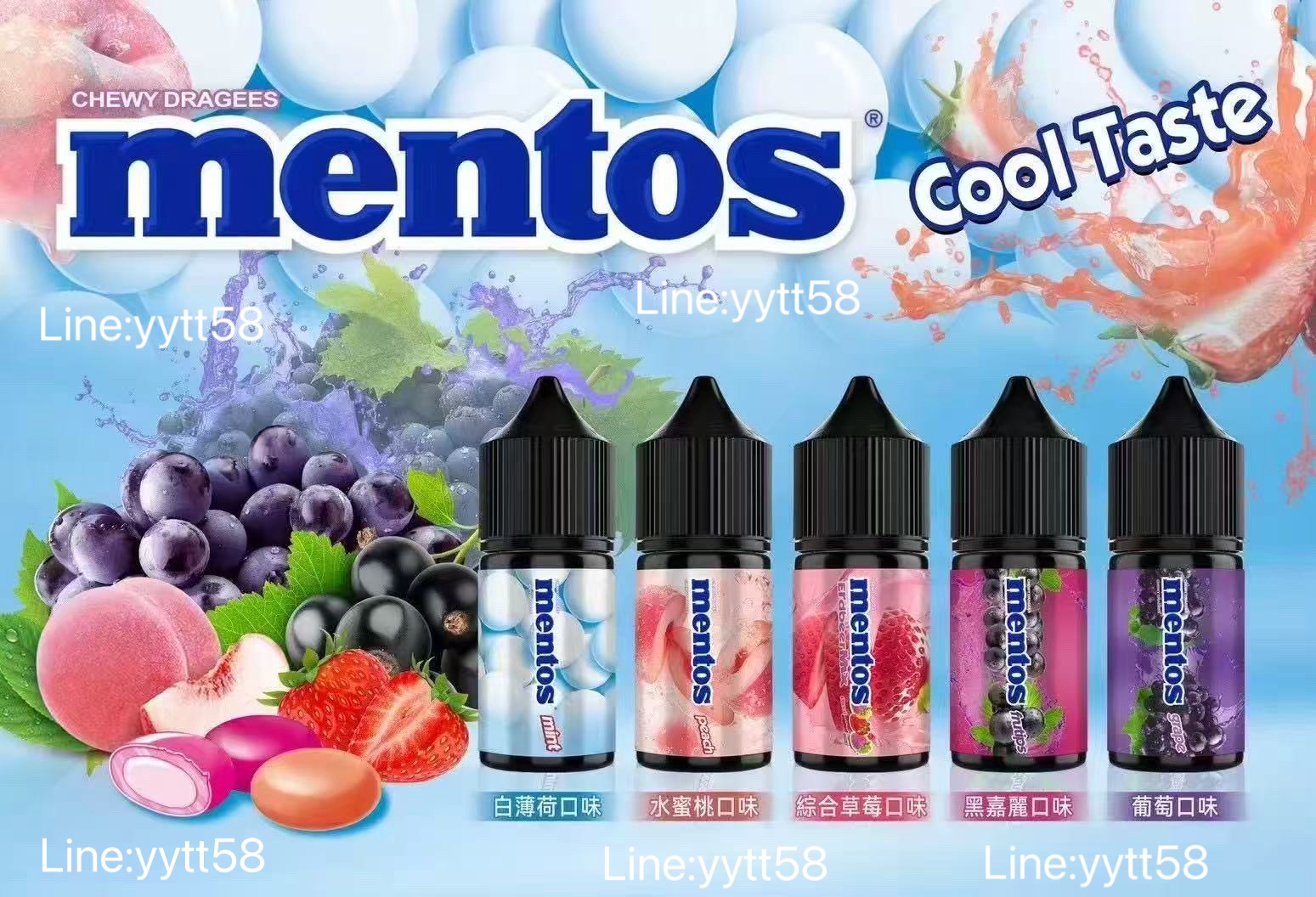 白薄荷, 水蜜桃, 草莓, 黑嘉麗, 葡萄