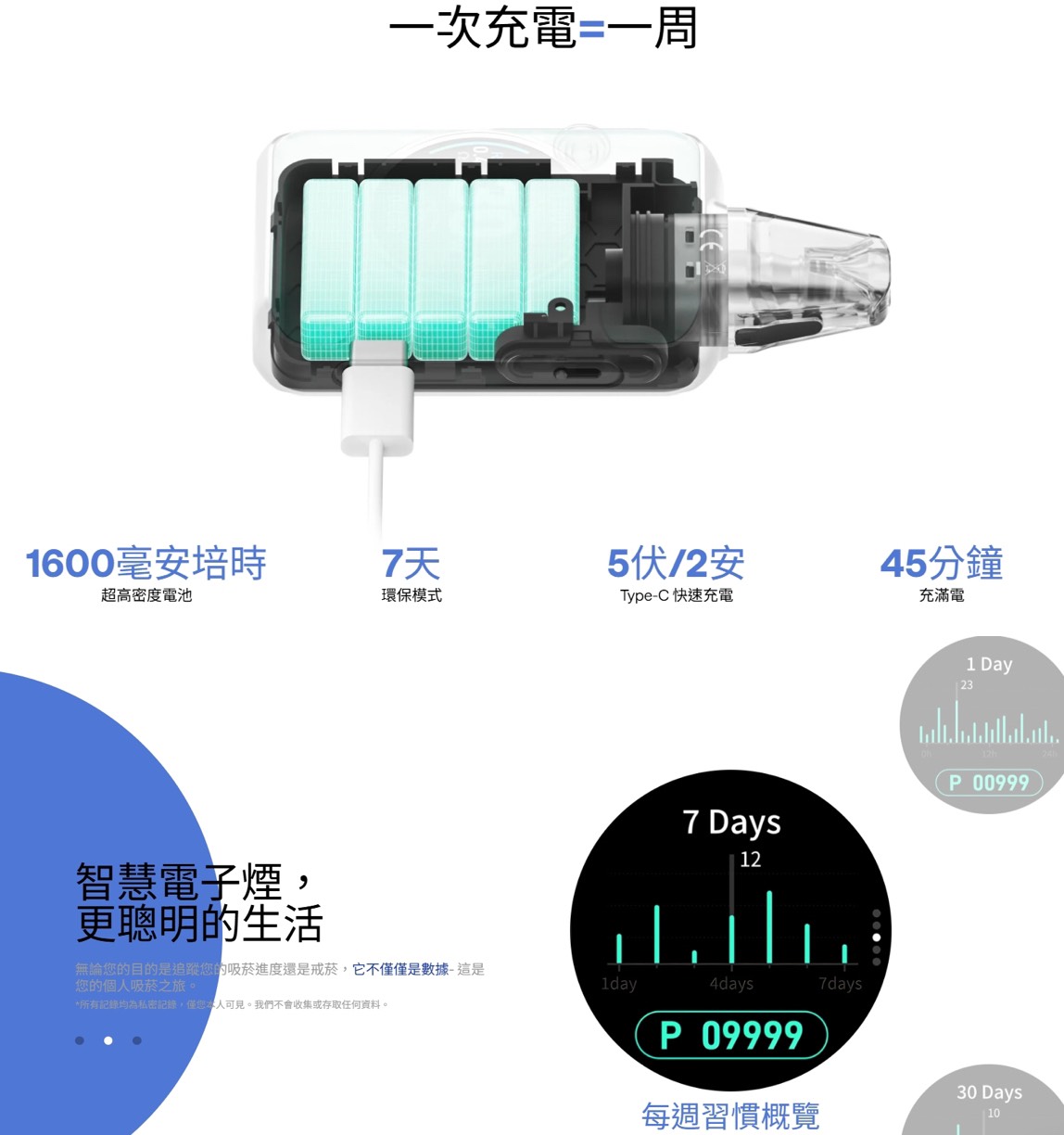 內建 Puff 統計功能,可記錄每天、每週、30 天使用數據,顯示成圖表,幫助控。