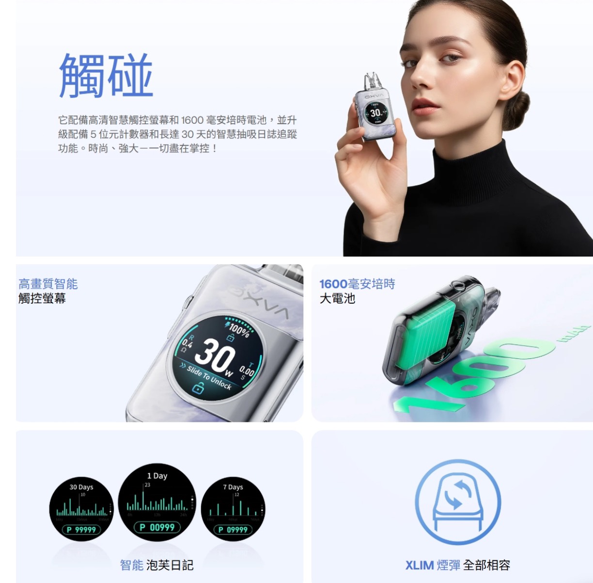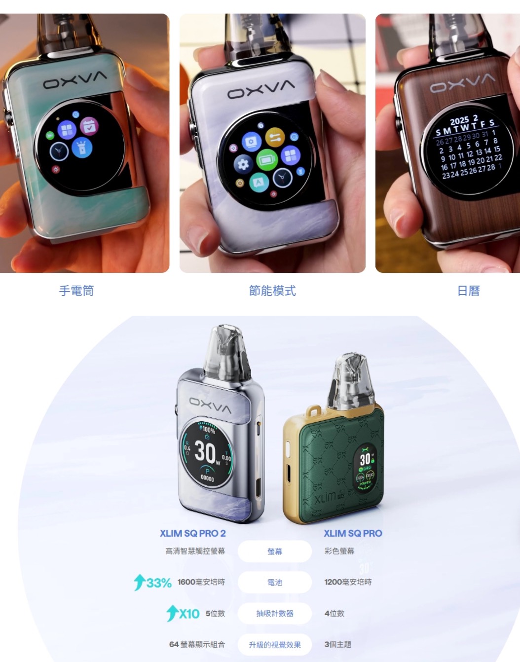 XLIM SQ Pro 2 是 OXVA 系列升級旗艦款,首度搭載 1.09 吋觸控螢幕,搭配 1600mAh 大電池、30W 調壓、抽吸紀錄與氣流調節,功能齊全、外型高質,是目前市場上最進階的小之一。