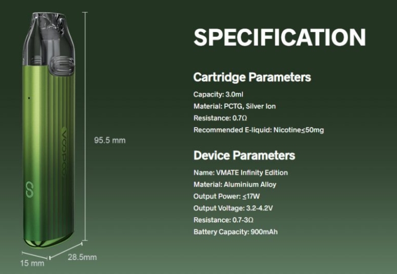 這款 VMATE Infinity Kit 升級搭載了最新的ITO技術,配備抗菌吸嘴、雙孔防漏設計,以及容量3ml、內建0.7ohm線圈的VMate V2煙彈。內建900mAh電池,最大輸出功率17W,還有貼合嘴型的設計、自動吸啟動以及自動功率匹配功能。