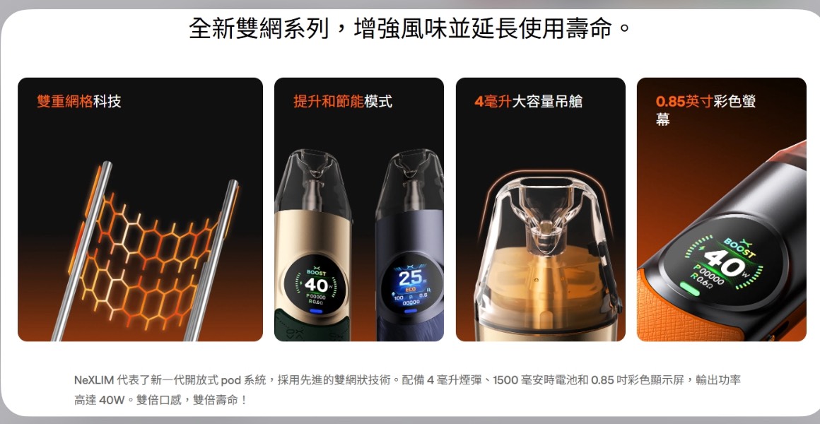 NeXLIM 的雙網格技術提供了卓越的風味體驗,BOOST 模式下風味更為濃郁,而 ECO 模式則延長電池和線圈的使用壽命。精確的氣流控制和自動啟動功能進一步提升了使用的便利性和滿意度。