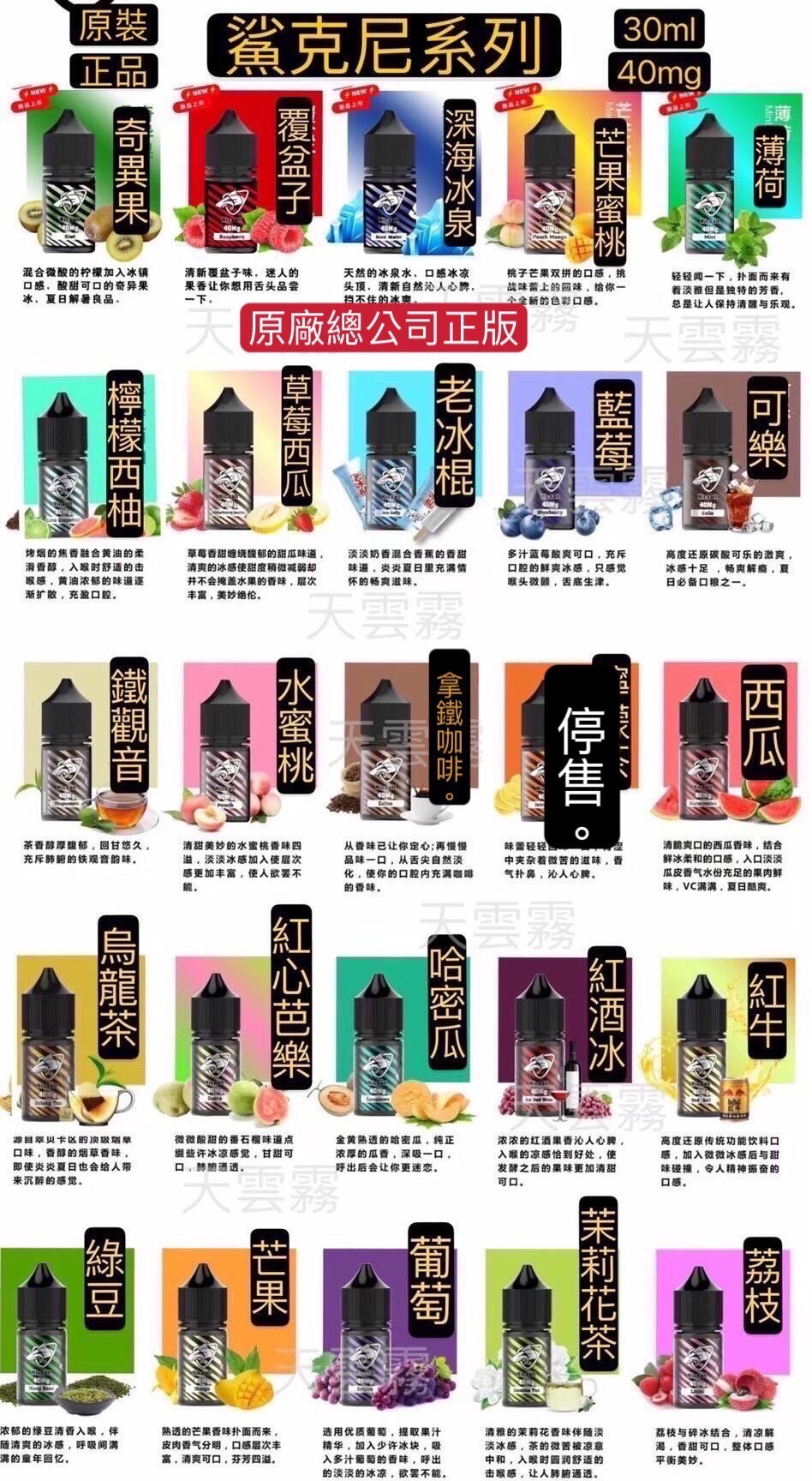 奇異果, 覆盆子, 深海冰泉, 芒果蜜桃, 薄荷, 檸檬西柚, 草莓西瓜, 老冰棍, 藍莓, 可樂, 鐵觀音, 水蜜桃, 拿鐵咖啡, 西瓜, 烏龍茶, 紅心芭樂, 哈密瓜, 紅酒冰, 紅牛, 綠豆, 芒果, 葡萄, 茉莉花茶, 荔枝 |