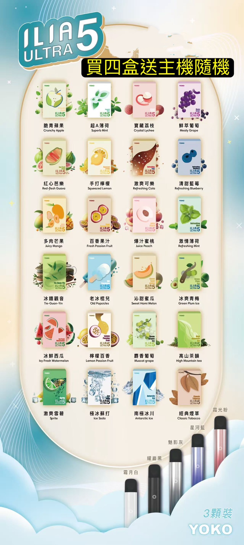 蘋果, 超A薄荷, 荔枝, 葡萄, 芭樂, 檸檬, 可樂, 藍莓, 芒果, 百香果, 蜜桃, 激情薄荷, 鐵觀音, 冰棍, 檸檬百香, 澀香葡萄, 蜜瓜, 青梅, 西瓜, 高山茶, 雪碧, 蘇打, 南極冰川, 經典草, 主機4盒送隨機色主機
