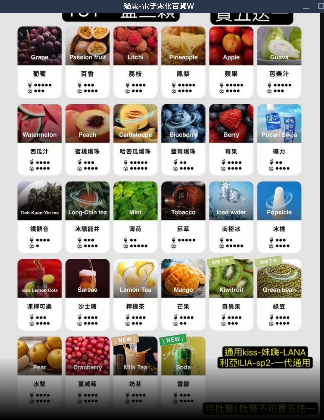 葡萄|百香果|荔枝|鳳梨|蘋果|芭樂|西瓜|蜜桃|哈密瓜|藍莓|莓果|寶礦力|鐵觀音|龍井|薄荷|菸草|南極冰|冰棍|可樂|沙士|檸檬茶|芒果|奇異果|綠豆|水梨|蔓越美|奶茶|雪碧|批發代理私談